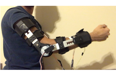 Arm Orthosis Braces, used to support the arm after it is paralyzed or atrophied, are expensive and inconvenient. Ortho is an arm orthosis that uses inputs from electromyographic muscle sensors, pressure sensors, and an accelerometer to mechanically assist arm movement. Ortho is an intelligent device that non-invasively gathers movement data and actively controls flexion via embedded sensors.