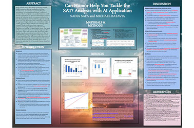 The presentation's main question is whether finding something to be ‘funny’ before taking the SAT helps high school student score higher on the exam. The main purpose for the project was because of increasing competition in high schools with rising mental health implications, especially for those who can not afford SAT prep for higher education. Sample students were given a humorous video to watch after completing a mini SAT exam, followed by a second exam to note changes in scores between the tests due to the humor intervention.