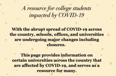 Corona Campus Watch was created in effort to be a resource for college students across the country to have concise access to the most up to date information regarding their campus' response to COVID-19. The site also contains a brief timeline of the outbreak, as well as resources for students during this time of quarantine.