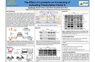 The Endoplasmic Reticulum (ER) mediates integral cellular processes such as protein synthesis, folding, and trafficking. Perturbation of these processes leads to a type of cellular stress known as ER stress, which activates the Unfolded Protein Response (UPR), that works to restore ER homeostasis. The UPR is regulated by three ER transmembrane proteins, including Activating Transcription factor 6 (ATF6). In response to ER stress, AFT6 is translocated to the Golgi where it undergoes proteolytic cleavage to release its N-terminal fragment. It is known that Sterol Regulatory Element Binding Proteins (SREBPs) are cleaved in a manner similar to ATF6 in order to regulate lipid homeostasis. Previous studies have shown that cleavage of SREBPs is promoted by Lovastatin, a drug prescribed to lower blood cholesterol levels. We hypothesized that Lovastatin should induce cleavage of ATF6 in a manner similar to SREBPs, thus triggering the UPR. To test our hypothesis, we treated HeLa cells, a cervical cancer cell line, with either Lovastatin or induced ER stress. The cells were lysed and the levels of known UPR proteins were tested by immunoblotting. Preliminary data suggest that Lovastatin treatment induces ER stress, as determined by enhanced level of a key chaperone known to be upregulated under ER stress conditions. Our results also demonstrate that HeLa cells upregulate the cytoprotective Akt signaling when treated with Lovastatin. Collectively, our results suggest that Lovastatin indeed induces ER stress-like conditions, triggering the UPR. Our current and future experiments are focused on determining the effect of lovastatin on cell viability.