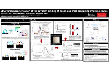 Oxidative stress is involved in many diseases, as high levels of reactive oxygen species (ROS) can damage DNA and other vital biomolecules. Kelch-like ECH-associated protein 1 (KEAP1) regulates the body’s response to oxidative stress. In the absence of oxidative stress, a KEAP1 homodimer binds transcription factor nuclear factor-like 2 (Nrf2), causing Nrf2 degradation. Oxidative stress causes KEAP1 to release Nrf2, allowing it to activate the production of antioxidant enzymes. Blocking the protein-protein interaction (PPI) between KEAP1 and Nrf2 could have great therapeutic value. However, PPIs frequently take place between large, flat interfaces, making these interactions difficult to block. A previous study with the Arkin Lab at UCSF identified 43 thiol-containing compounds (monophores) that can be covalently tethered to KEAP1 at a cysteine near the protein interface. The goal of this project is to characterize interactions between KEAP1 and the monophores using X-ray crystallography to obtain structures of the protein-monophore complexes, or adducts. Structural data will allow us to select monophores suitable for scaffold optimization, a technique in which a smaller compound is elaborated to improve its potency and selectivity. To identify adduct crystallization conditions, the DTNB assay, which measures reactive cysteine groups in a protein, was used to screen buffer conditions without dithiothreitol (DTT). A high-throughput version of this assay was developed and utilized, along with differential scanning fluorimetry (DSF), to identify stabilizing conditions for adduct formation. This assay was used to identify a new buffer condition (50 mM EPPS, 50 mM NaCl, pH 8.0) for adduct crystallization attempts.