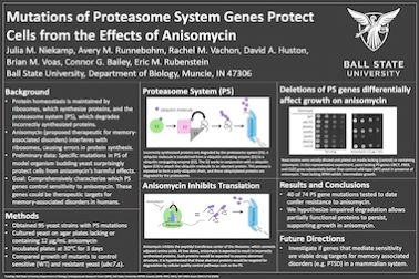 strains lacking specific protein quality control genes exhibit growth advantages in the presence of anisomycin. This was surprising, since anisomycin is expected to promote formation of aberrant, truncated protein molecules. Yeast strains lacking a limited panel of genes involved in protein quality control and regulated protein degradation were also tested for resistance to anisomycin; no clear pattern to which mutants exhibited a growth advantage was observed. Ongoing efforts are aimed at comprehensively evaluating the roles of UPS genes in anisomycin resistance. Toward this end, yeast lacking each of 95 genes involved in protein degradation are being cultured in the presence and absence of anisomycin. Following growth assays, data will be analyzed to identify commonalities in genes conferring similar responses to anisomycin. Since the UPS is overwhelmingly conserved between yeast and humans, this work may contribute to an understanding of the cellular response to anisomycin and its potential therapeutic role for memory-associated disorders.