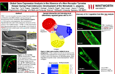 Using RNA Seq, the relevance of genes that are differentially expressed in the absence of FRK-1 were analyzed using Functional Enrichment Analysis (FEA). FEA identified twenty- one gene clusters of significantly affected genes of which seven were chosen for further analysis. Once identified, we confirmed gene expression data in vivo, examined associated interactions of differentially expressed genes, and began examining novel gene signaling in association with FRK-1 activity. Here we present our RNA Seq analysis and results that show FRK-1 is required as a master regulator for proper expression in specific pathways associated with developmental growth, extra-cellular matrix cuticle formation, cell motility, cell adhesion and cellular localization.