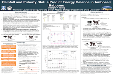 Social-living primates experience changes in their physical and social environments throughout their lives. Sometimes-extreme environmental changes lead to fluctuations in food availability and influence the nature of social interactions, changing primates’ energy intake and expenditure on daily and life-long bases. Growth and development before and during puberty creates additional energy demands. Balancing energetic demands of environmental fluctuations and growth with energy available for intake is essential for survival. Using triiodythyronine (T3) concentrations in baboons as a measure of energy balance, this paper seeks to quantify energetic balance from infancy to adolescence, and to analyze which environmental factors best predict T3 concentrations. First, I characterize longitudinal patterns of variation in T3 concentrations both in males and in females. Second, results from model selection show the strong predictive negative effect of sexual maturation and positive effect of cumulative rainfall on T3 concentrations.