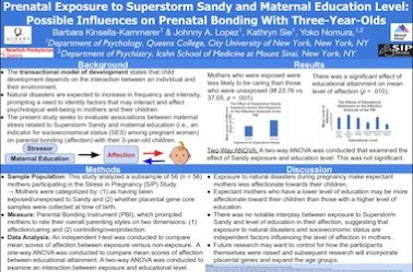 Superstorm Sandy in 2012 was one of the deadliest and most destructive hurricanes to hit the United States in last two decades. Due to the ever-increasing threat resulting from climate change, it is expected that severe and disastrous storms will become more frequent. This study examined the effects of exposure, versus non-exposure, to Superstorm Sandy in-utero on parental bonding between mothers and three-year-old children. This study further examined additional influence of the participants’ educational level on quality of bonding with their children. An independent-samples t-test revealed a significant effect of Superstorm Sandy exposure on the Parental Bonding Instrument (PBI) Affection subscale (p = .001). Furthermore, a one-way analysis of variance (ANOVA) showed a significant effect that lower (i.e., Bachelor’s degree and high school degree) educational attainment was associated with an increase in care/affection for their children (p = .010). This study emphasizes how individuals exposed to natural disasters, as well as those with lower education attainment, may exhibit lower levels of care toward their children. Further research needs to be conducted to examine why mothers who were exposed to natural disasters during pregnancy were less caring than those who were not.