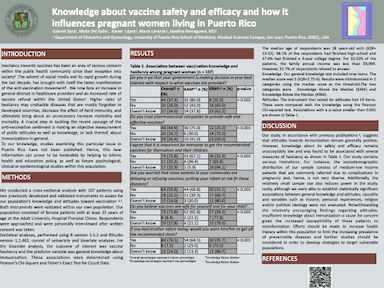Background and objectives: Hesitancy towards vaccines has been an obstacle and an area of serious concern within the public health community for many years. The spread of misinformation on social media and the internet in general has been associated with a resurgence of the anti-vaccination movement which has lead to numerous measles outbreaks within the United States. A crucial step in tackling the recent upsurge of this sentiment is making an objective measurement of public attitudes as well as knowledge about immunizations in general. Methods: To better understand this phenomenon and establish a baseline on the island, we created a cross sectional study with 64 female patients at the Adult University Hospital (AUH) prenatal clinics in Puerto Rico Medical Center using two previously developed and validated instruments to assess for our populations knowledge and attitudes about vaccination while exploring their association with each patient’s sociodemographic characteristics. Results: Our study, in accordance with previous publications, suggests that attitudes towards immunization remain generally positive. However, knowledge about its safety and its interaction with the immune system remains unacceptably low. Conclusion: Notwithstanding the encouraging findings regarding attitudes, insufficient knowledge is of high concern given the increased susceptibility to misinformation.  Efforts should be made to increase health literacy within this population to limit the increasing prevalence of preventable diseases. Acknowledgements: The authors declare they have no conflict of interest. Approved by IRB.