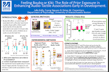The bouba/kiki effect, a naturally occurring association between abstract shapes, spikey or round, and nonsense words, /kiki/ or /baba/, respectively, is found across different senses (see Spence, 2011). Previously, we found developmental changes: compared to adults, 6-8 year-old children showed weaker audio-tactile (AT) associations between heard nonsense sounds and felt abstract shapes, even when shown how to optimally explore shapes via touch or given twice as many trials of exposure. Interestingly, AT associations were strengthened if participants first matched the same sounds to complementary seen abstract shapes (audio-visual). Given that prior visual exposure to shapes enhances AT associations and that early-blindness (Fryer et al., 2014) weakens AT associations in adults, we considered if previous visual experience is critical or if what matters is highlighting relevant shape features, something more automatic for vision than touch.