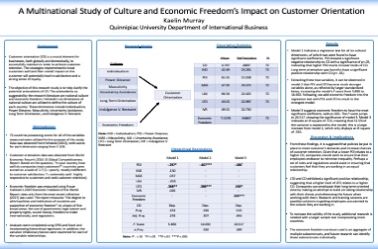 In order to achieve and maintain customer retention, customer orientation is a crucial element for both global and domestic businesses. Customer orientation is defined in this study as the way in  which companies treat their customers. The strategies implemented to treat customers well and their  overall impact on the customer will potentially lead to satisfaction and a strong sense of loyalty.  The objective of this research study was to explore the impact of culture and economic freedom on  customer orientation. There is limited research suggesting that these variables play a role in the  degree of customer orientation achieved in a country. The study utilized 72 countries possessing  data for customer orientation, culture, and economic freedom. Using SPSS and Excel, a hierarchical  regression model was used to examine the relationships between these variables. Additionally, a variance inflationary factor was utilized with the models to measure the degree of  multicollinearity between the variables. The results show that a country’s level of power distance, long term orientation, as well as economic freedom have a significant impact on how well companies treat their customers. Specifically, it was found that a lower degree of power distance and a higher degree of long-term orientation and economic freedom relates to a higher degree of customer orientation in that country. It is suggested from these results that international managers need to adjust their approach to customer orientation depending on cultural and economic freedom factors within their country of operation.