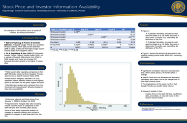 Information and investment decisions are directly related according to all fundamental models of corporate finance and economics. As such, this study proposes a direct measurement of capturing investor information with the use of Google Trends - Search Volume Index (SVI). We sampled the SVI of companies in the S&P 500 and their monthly stock prices; and monthly closing stock prices extracted from the University of Pennsylvania’s Wharton Research Data Services database (WRDS). We ran a time-series regression from 2008 to 2018 and found that there is a significant relationship between SVI’s web searches and the price of a stock 2 to 4 months from the time the search index makes a major change. The relationship between the SVI and the stock’s monthly price is negative and statistically significant at the 2 month lag. In our findings, a 3 standard deviation increase in web searches leads to a .48 dollar decrease in stock price 2 months out, controlling all attributes of the firm. The implications of this research findings confirm that Google Trends’ Search Volume Index can predict stock prices.