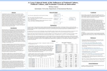Understanding how nations can increase their levels of innovation, and the variables that can contribute to innovation, is vital for achieving a competitive advantage in the modern world. The available research literature suggests a number of possible antecedents of innovational activity, including national culture, political culture, and economic wealth. The objective of this research is to explore the degree to which these variables can impact a country’s innovation.