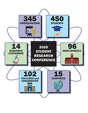 The 2021 conference will be held virtually and welcome 400-500 high achieving students from schools and colleges across the United States. Students will contribute oral and poster presentations in most research disciplines. High school participants have been alums of nationally and internationally recognized competitions such as the Regeneron (formerly Intel) Science and Engineering Fair and Conrad Challenge.