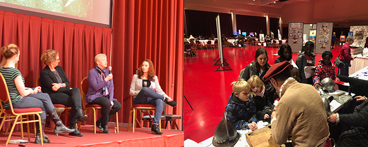 Science talks, shown above on the left, were part of the STEM Art and Film Festival. The Guilde of St. Michael, on right, gave attendees the chance to try on 16th-century style armour.