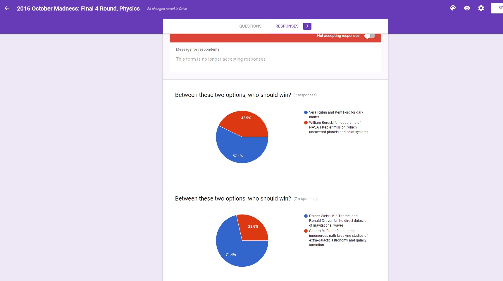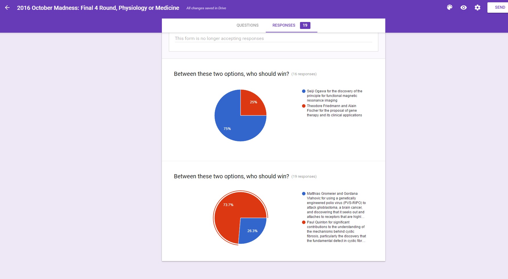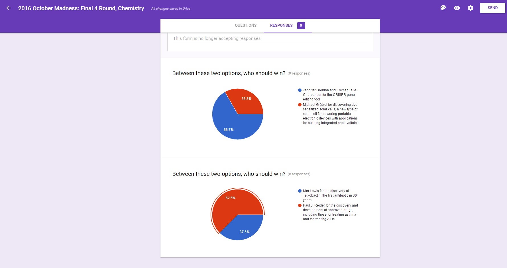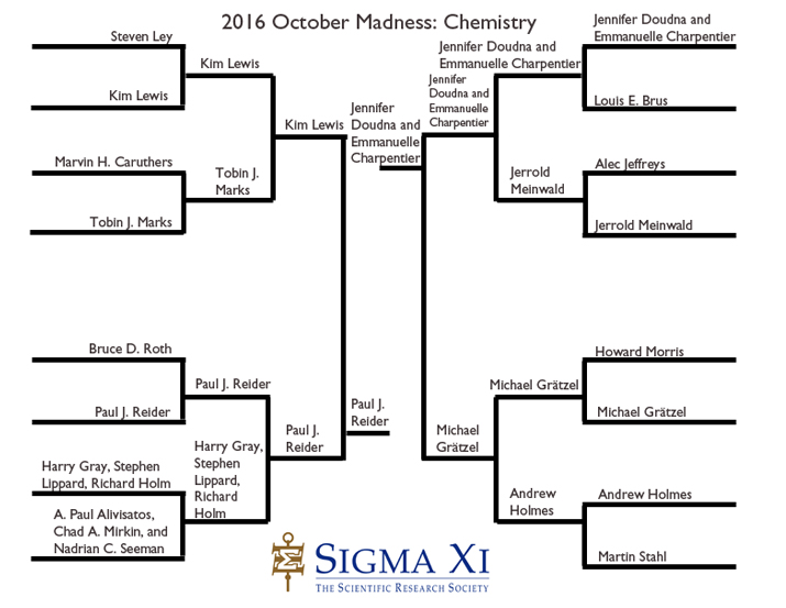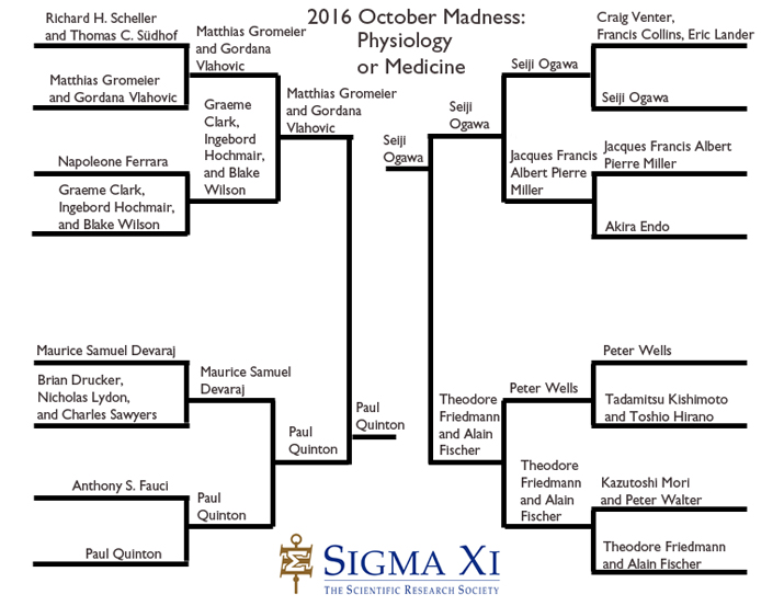We made it to the finals for this year's edition of October Madness, Sigma Xi's Nobel Prize prediction contest. Thanks to all who voted last week! Everyone is invited to vote this week to help complete our predictions for the 2016 Nobel Prize in chemistry, physics, and physiology or medicine. We're also predicting the winner of the Sveriges Riksbank Prize in Economic Sciences.