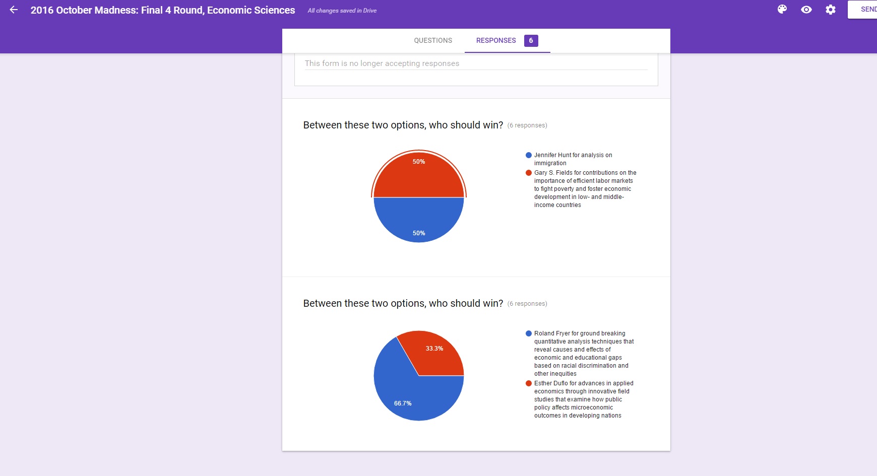 A tie in Economic Sciences between Jennifer Hunt and Gary S. Fields was broken based on the number of votes each received in the Elite 8 round. Fields advanced to the finals.