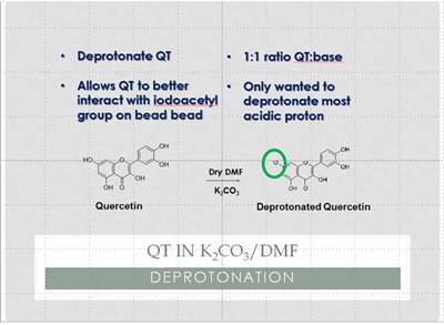 | Simple changes can improve Slide 6. Improvements are shown in slide 7. Changing the color and adding bold font and shadow to the main text makes it easier to read, as does changing the font size and boldness in the minor text. In addition, a simple circle denotes the location on the deprotonated quercetin molecule where the chemical composition has changed. |