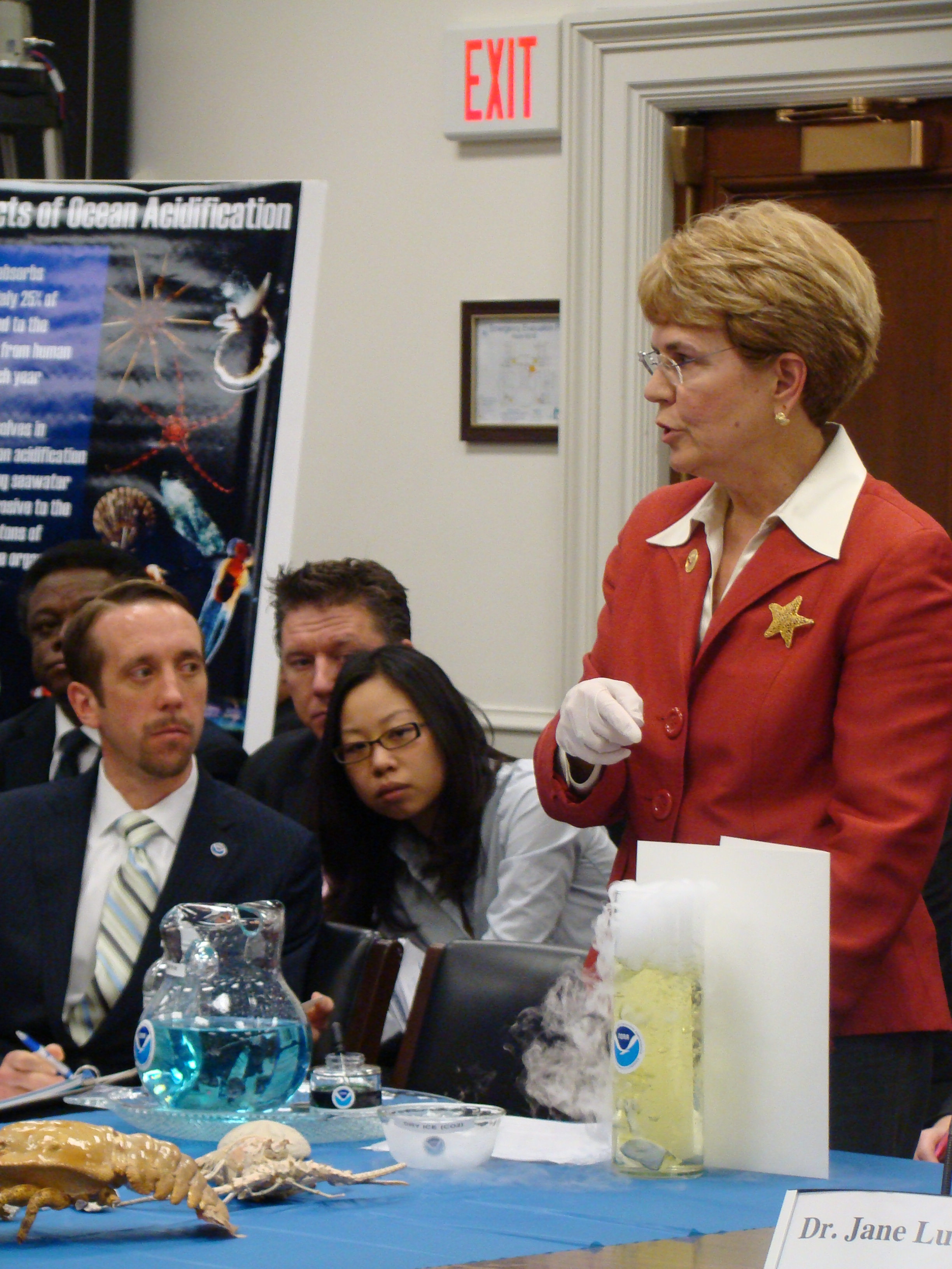 Image two: Former NOAA administrator Jane Lubchenco demonstrates the effects of carbon dioxide on ocean acidification during a Congressional hearing. (Source: Office of Sen. Ed Markey.)