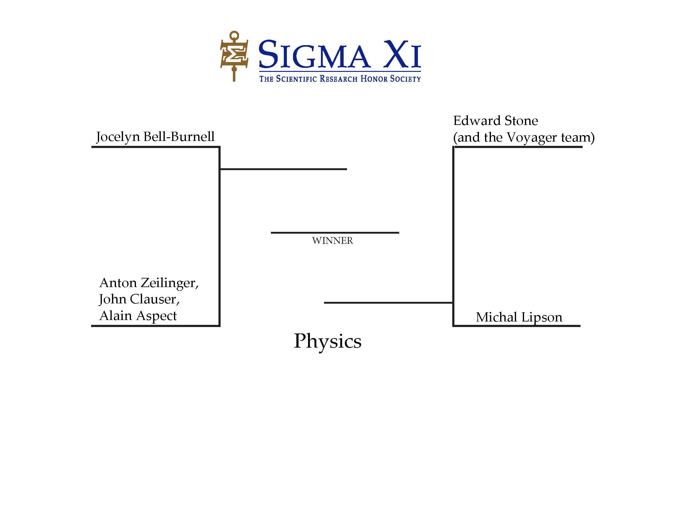 We're down to the Final Four of Sigma Xi's Nobel Prize prediction contest, October Madness! Vote to make sure your top picks make it to the finals. Each person is eligible to cast one vote per category, for a total of three votes.