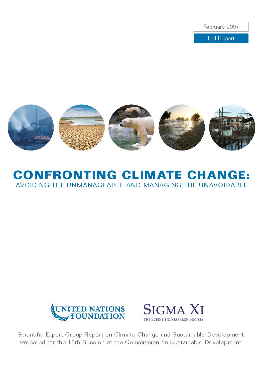 On February 27, 2007, the United Nations Foundation and Sigma Xi, The Scientific Research Society released Confronting Climate Change: Avoiding the Unmanageable and Managing the Unavoidable, the final report of the Scientific Expert Group on Climate Change and Sustainable Development. The report outlines a roadmap for preventing unmanageable climate changes and adapting to the degree of change that can no longer be avoided.