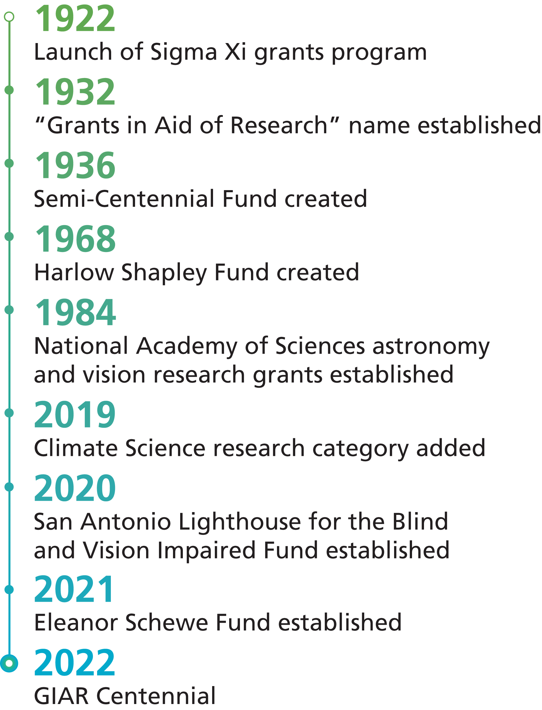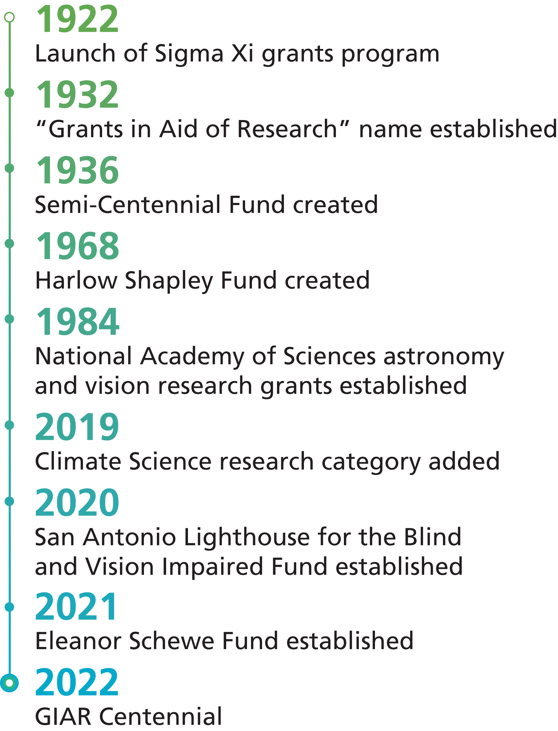 The Sigma Xi Grants in Aid of Research (GIAR) program has provided undergraduate and graduate students with valuable educational experiences since 1922. By encouraging close working relationships between students and mentors, the program promotes scientific excellence and achievement through hands-on learning. There are two cohorts of grants awarded each year in April and October, across most disciplines of science and engineering. The average student grant amount is $1,000. Designated funds from the National Academy of Sciences allow for grants of up to $5,000 for astronomy research and $2,500 for vision related research.